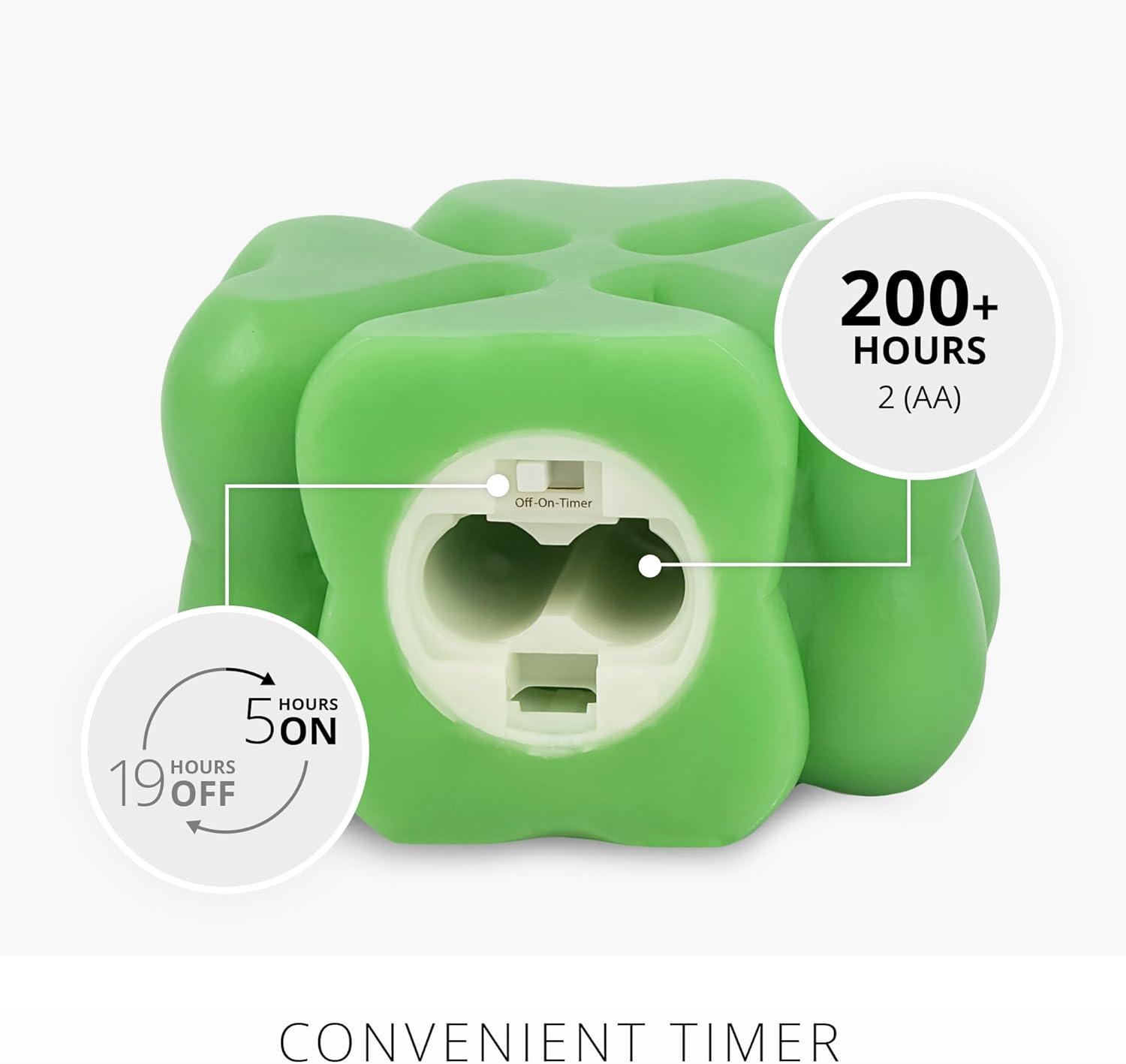 The Luminara Classic Green 4-Leaf Clover candle is designed to look just like a real wick open-flame candle. The body is crafted from hand-poured 100% paraffin wax around the electric core. The texture is just as smooth and realistic as it looks, and creates a lovely ambiance in any room. It's perfect for your St. Patrick's Day display on the mantelpiece, bookshelf, or dining table centerpiece. Or, display year round to showcase your Irish pride!