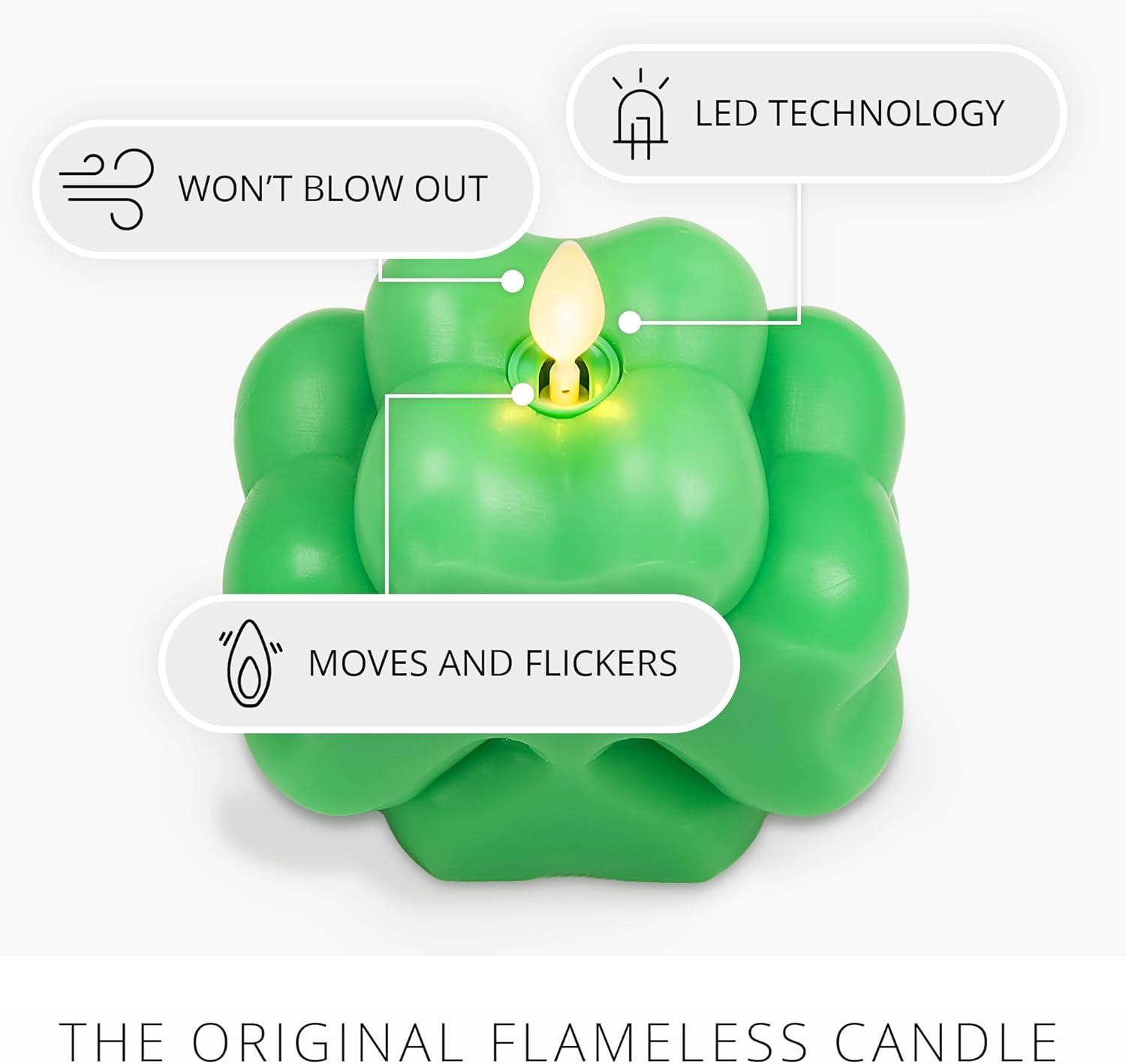 Using patented Flickering Real-Flame technology, the delicate plastic flame tongue flickers in the warm white LED light. The wax body also lights up, glowing just like an actual flame candle. The gentle illumination is perfect for creating a subtle, yet cheerful decoration. It also makes a darling little Saint Patricks themed nightlight for children.
