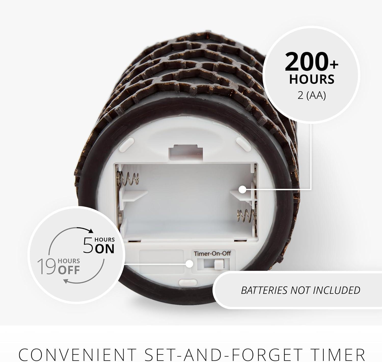 AUTOMATIC TIMER FEATURE: Includes a convenient 5-hour on/19-hour off timer function for set-and-forget operation. Turn on with the bottom switch. Light up your dining table centerpiece or mantle decoration at the same time every day.