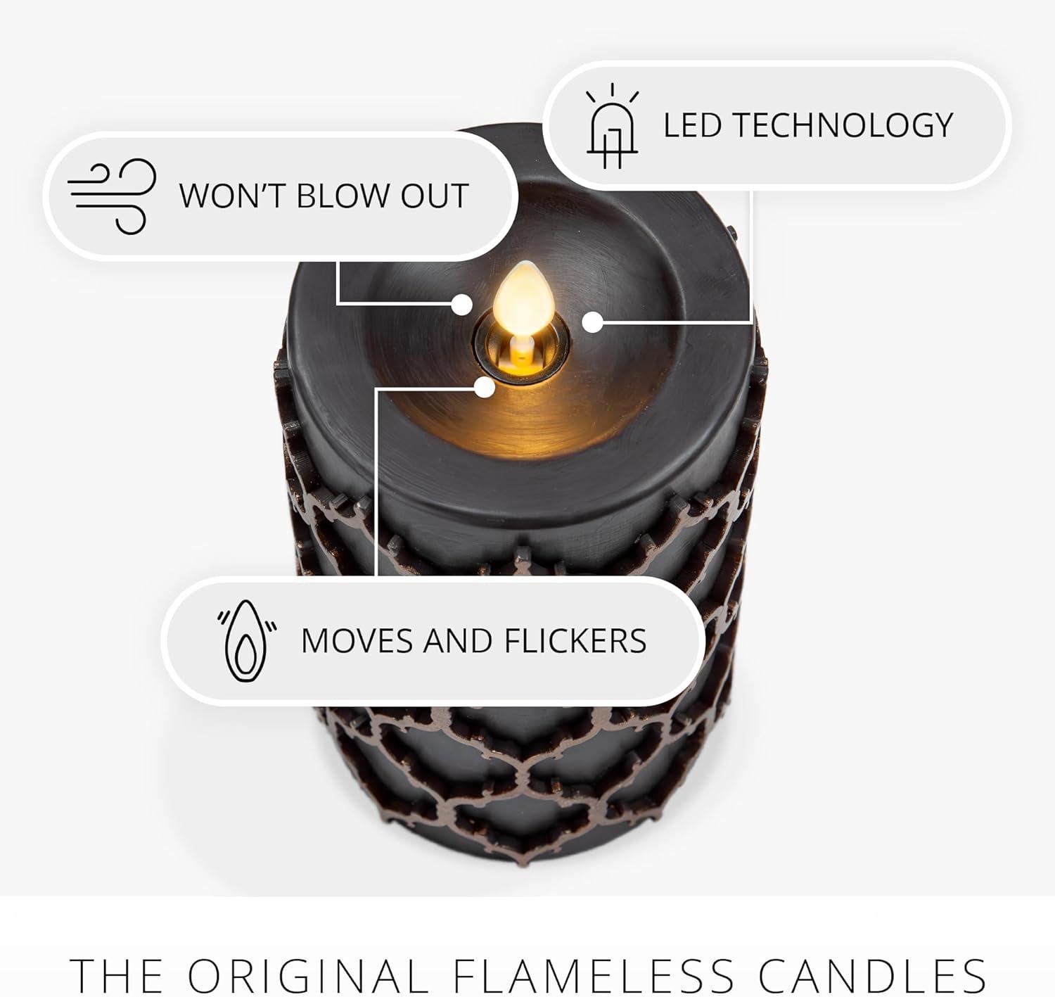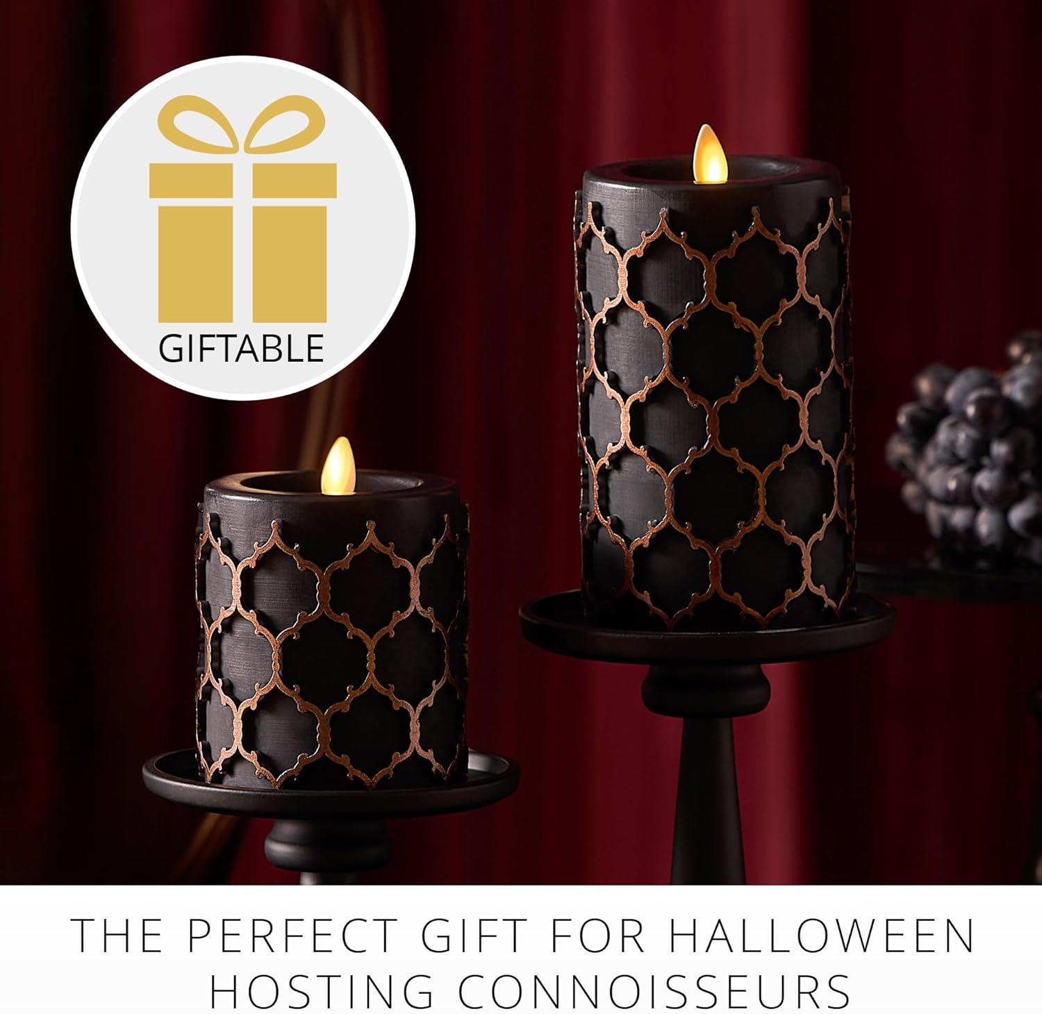 Luminara Black Embossed Fretwork 3.5″ x 4.5″ Pillar, AA Battery Operated w/Timer Function, Flickering Flameless LED Light Real Wax Candle for Indoor Home Decoration, for Dining Room Table Centerpiece