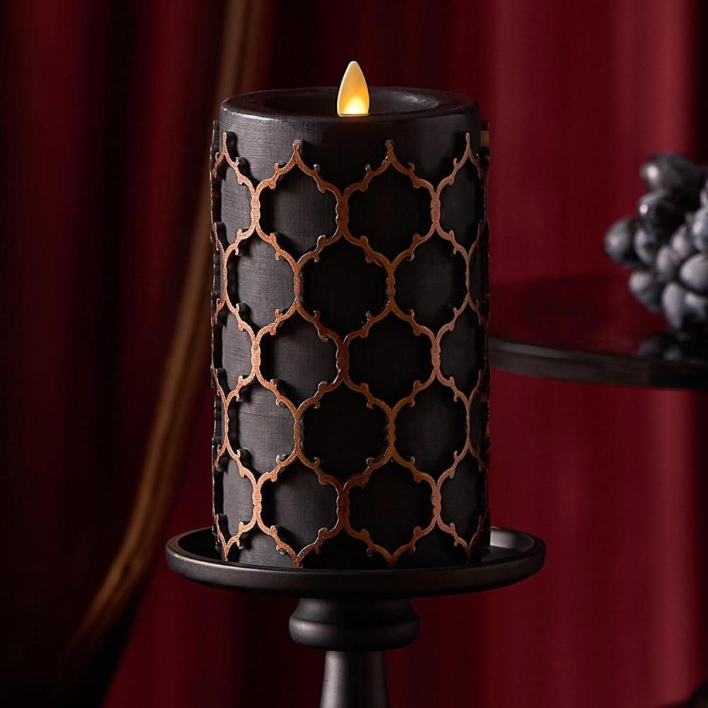 ELEGANT EMBOSSED PATTERN: Decorative pillar candle features sophisticated quatrefoil Moroccan-style design adding texture to any halloween or home decor setting – stunning black candle decoration