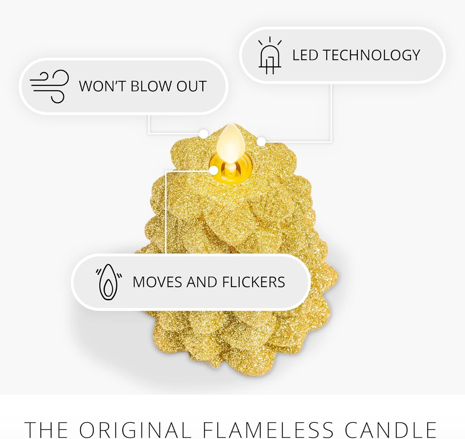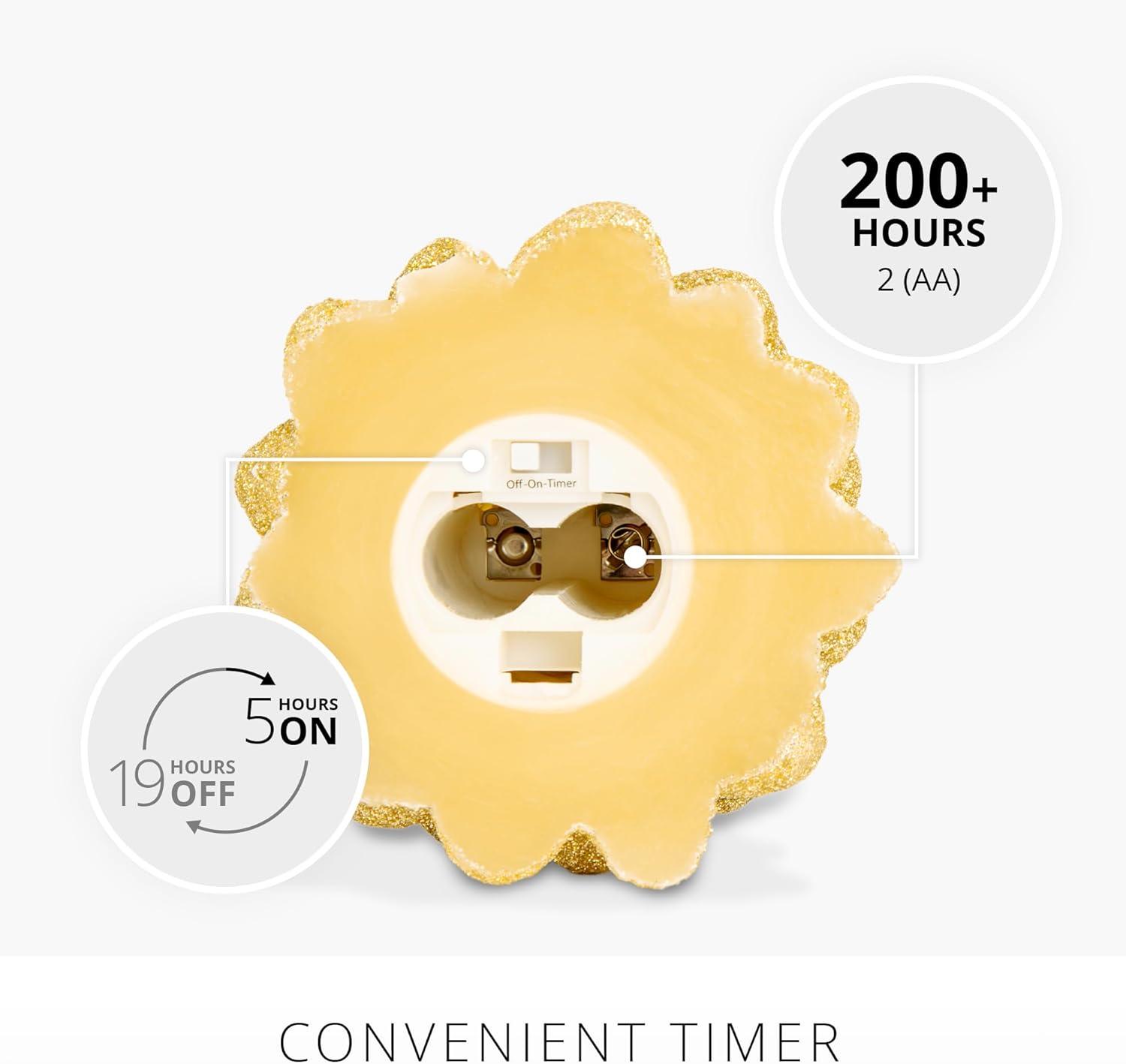 Powered by 2 AA batteries (not included), each candle offers 200 hours of safe and long-lasting illumination. Set the timer for 5 hours of brilliance, followed by an automatic 19-hour shutdown.