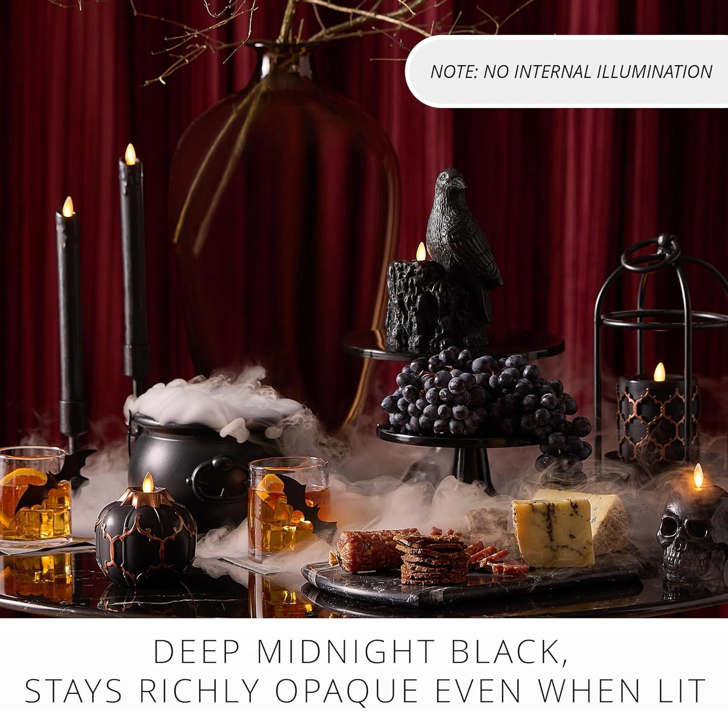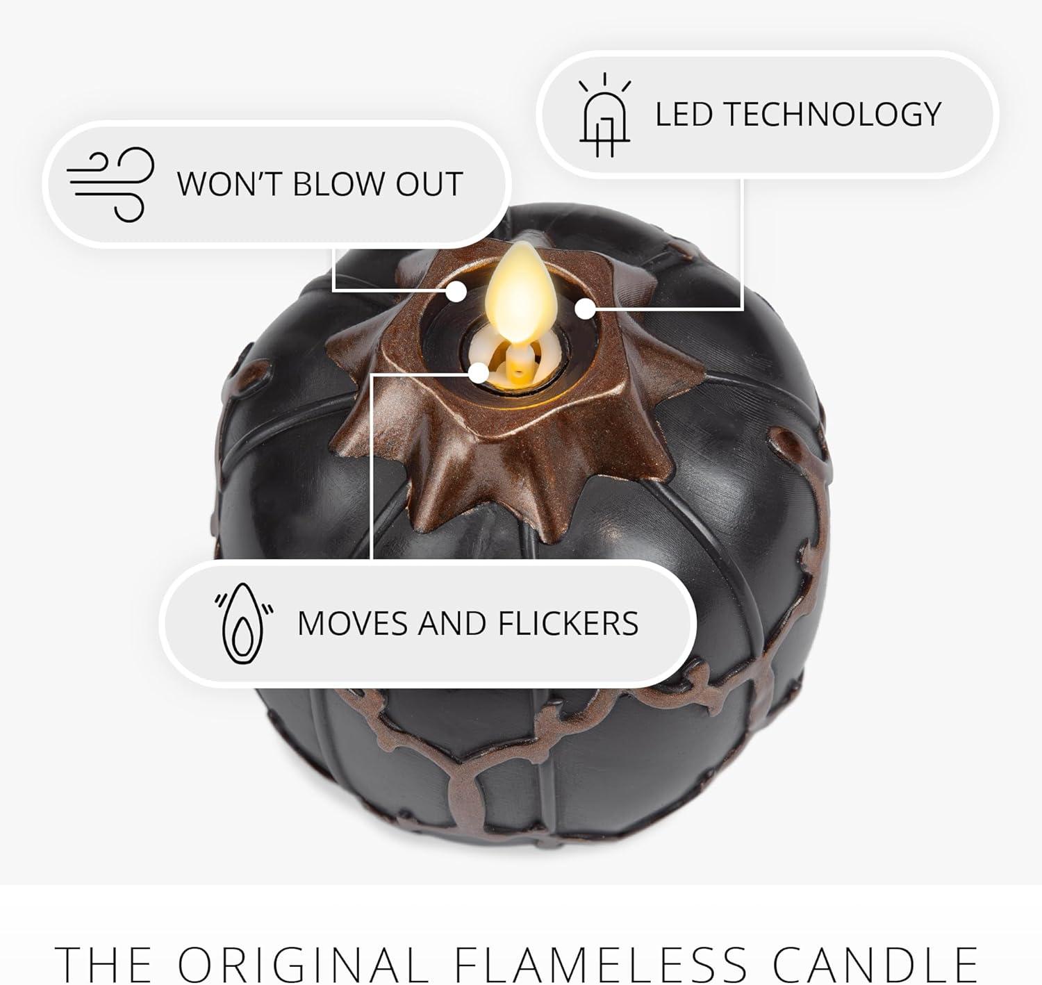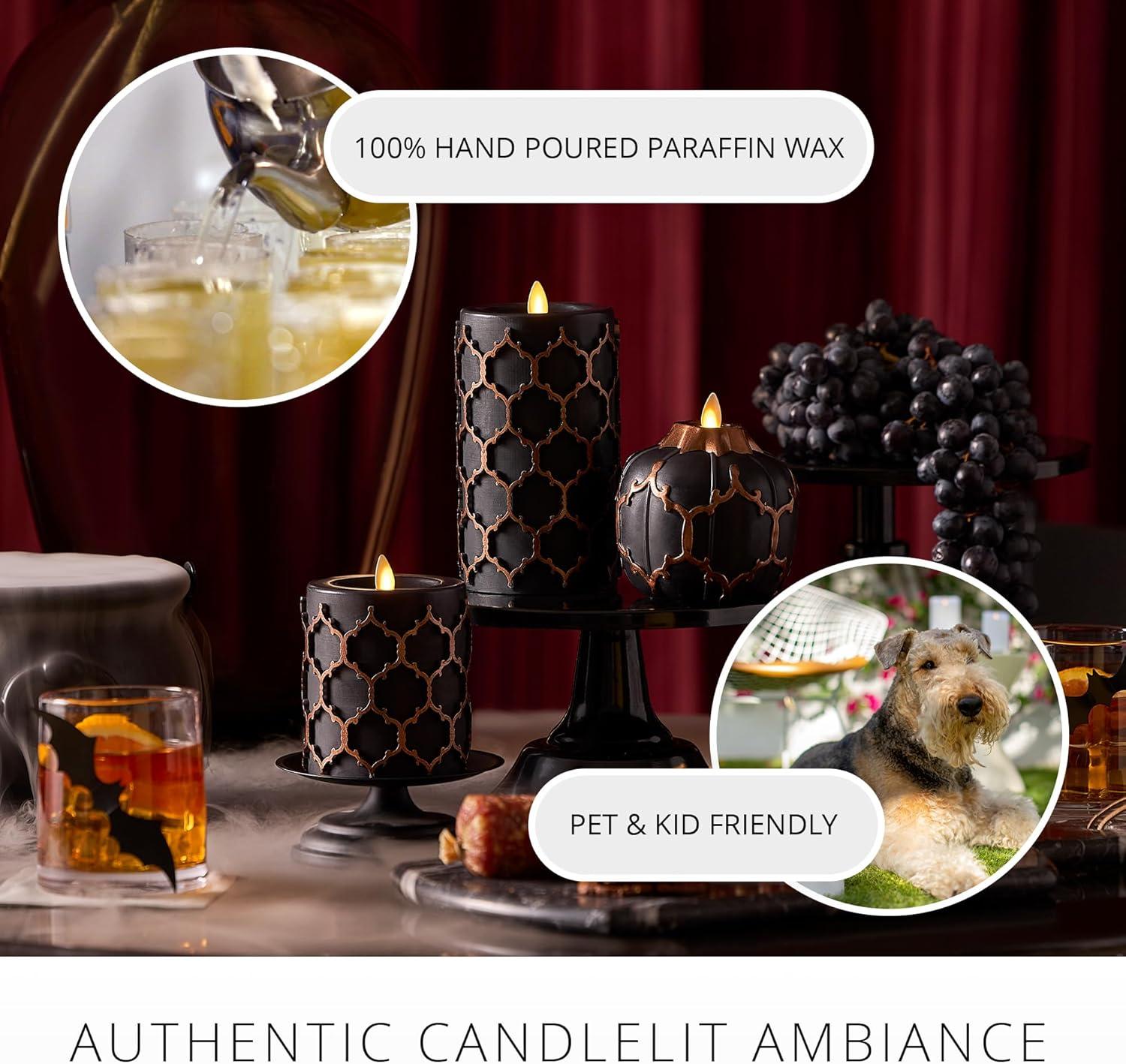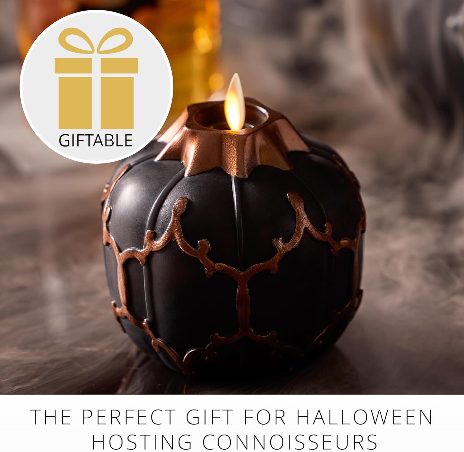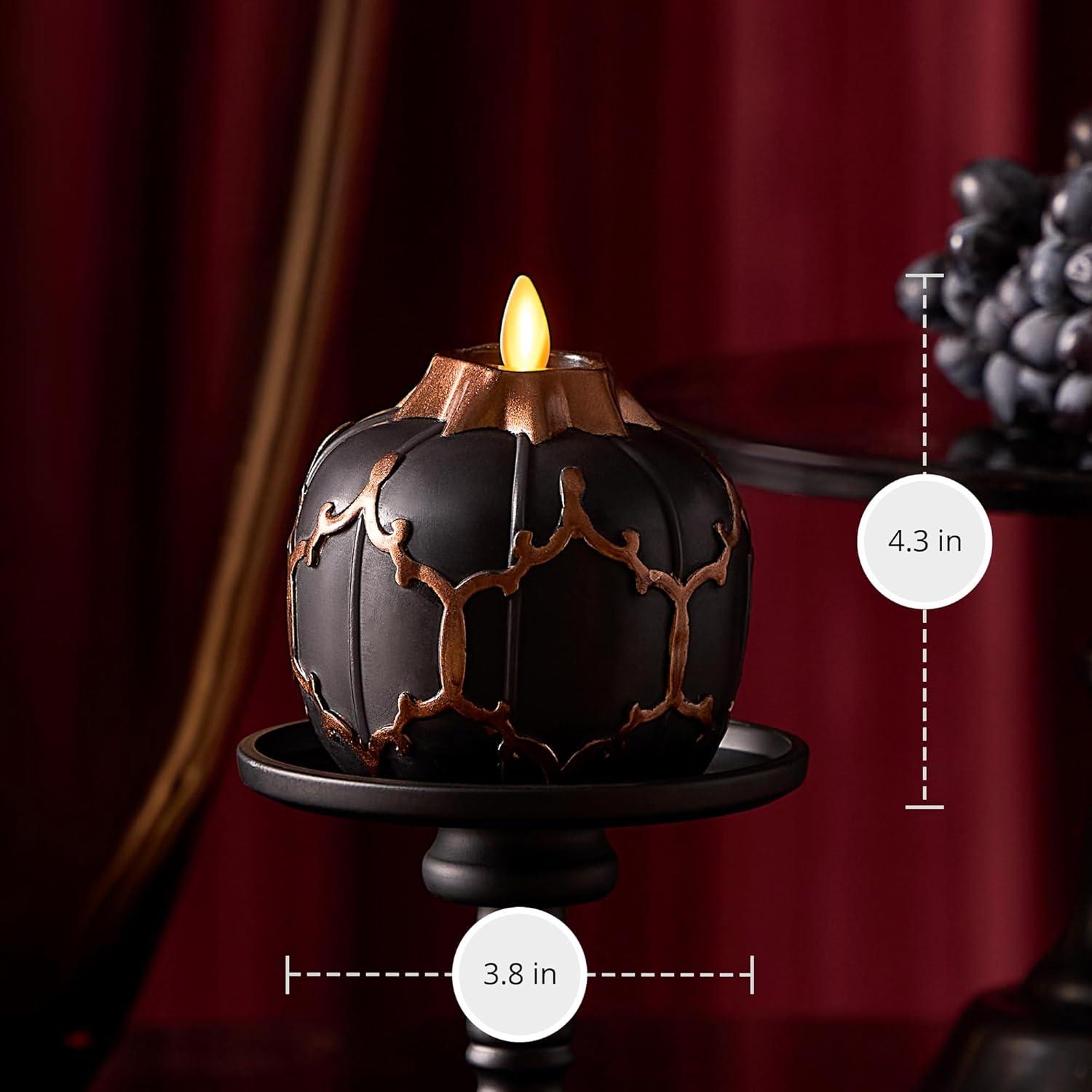Add a touch of gothic glamour to your Halloween decor with this black flameless pumpkin candle, featuring bronze fretwork and Luminara’s ultra-realistic flickering flame.