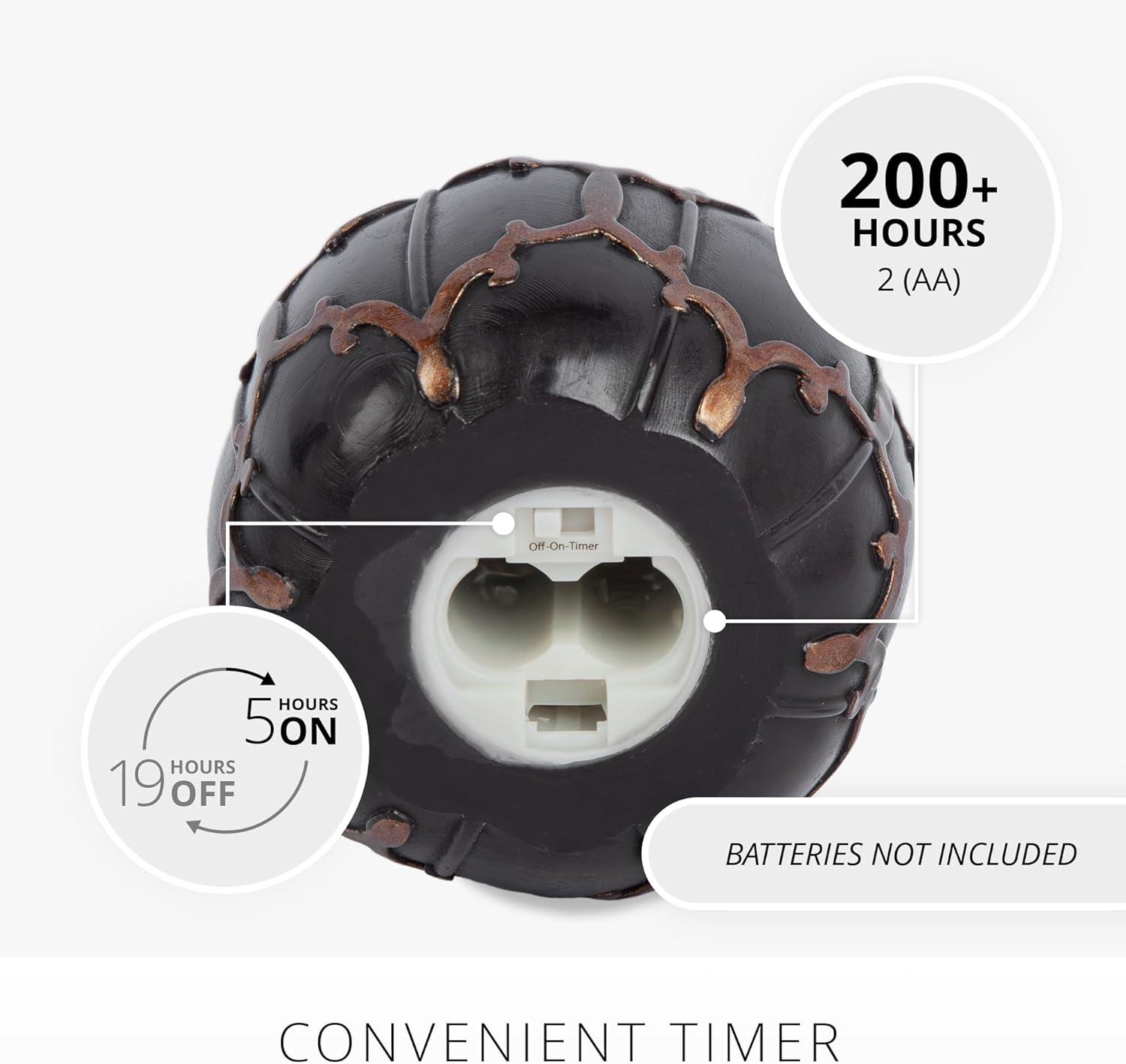 Powered by 2 AA batteries (not included), each candle offers 200 hours of safe and long-lasting illumination. Set the timer for 5 hours of brilliance, followed by an automatic 19-hour shutdown.