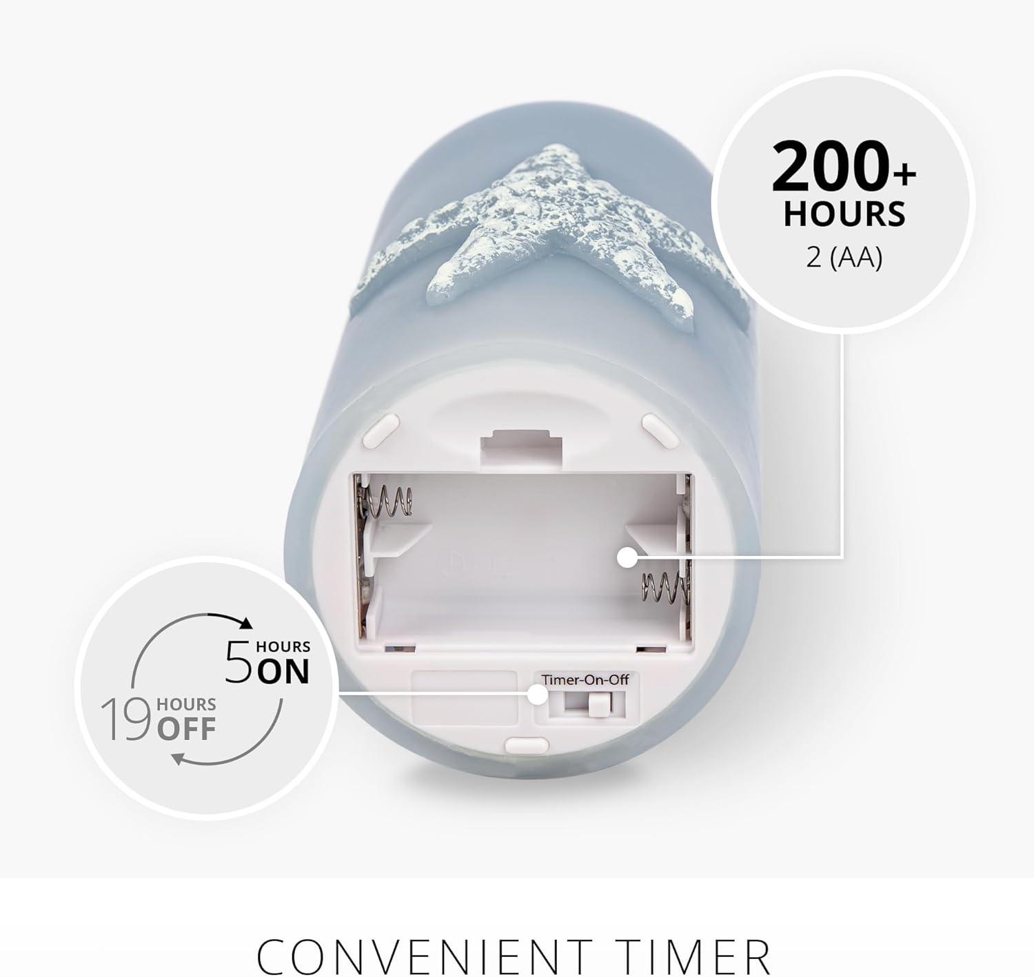 Powered by 2 AA batteries (not included), each candle offers 200 hours of safe and long-lasting illumination. Set the timer for 5 hours of brilliance, followed by an automatic 19-hour shutdown.