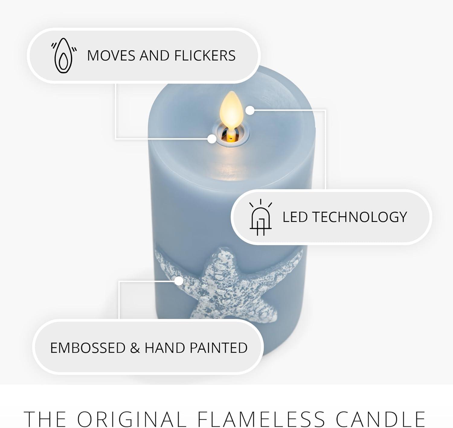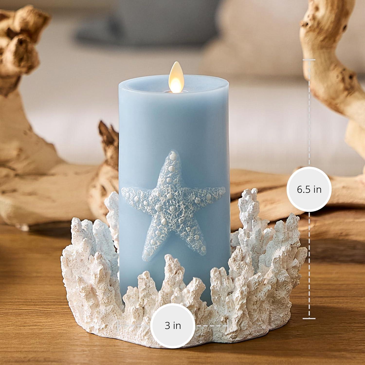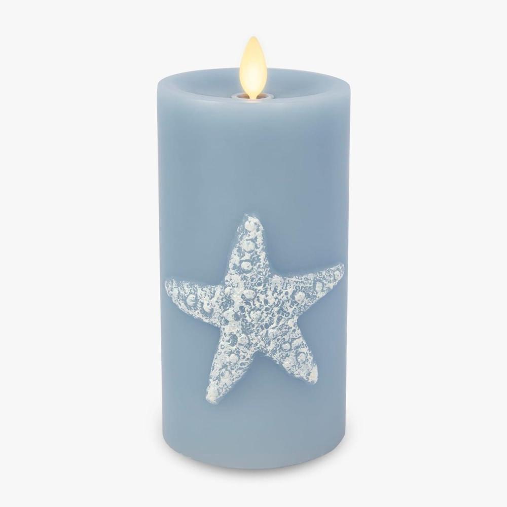 Hand-poured in soft sea blue wax, each Soft Chambray Embossed Starfish Flameless Candle Pillar is adorned with a starfish relief that has a beautiful drybrush finish that radiates with costal charm in any space.