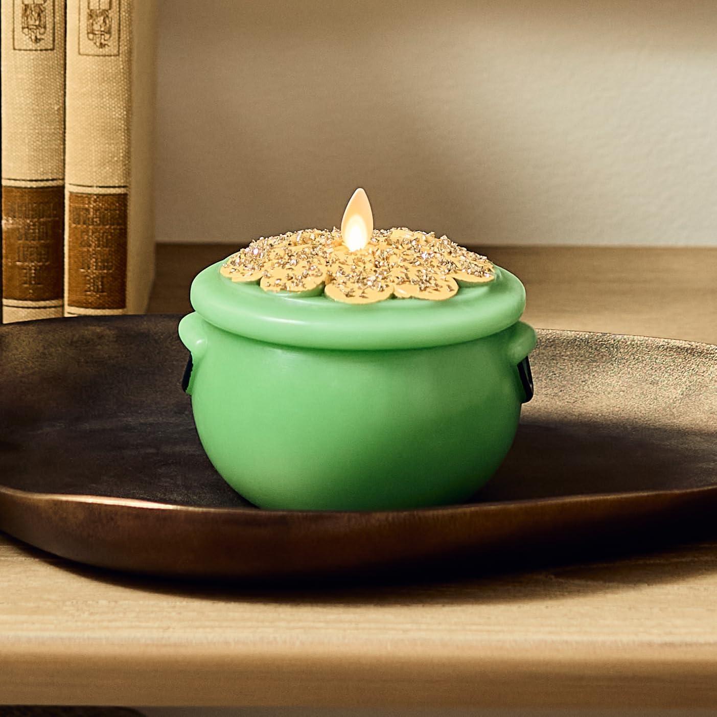 The Luminara Lucky Green Pot of Gold candle is designed to look just like a real wick open-flame candle. The body is crafted from hand-poured 100% paraffin wax around the electric core. The texture is just as smooth and realistic as it looks, and creates a lovely ambiance in any room. It's perfect for your St. Patrick's Day display on the mantelpiece, bookshelf, or dining table centerpiece. Or, display year round to showcase your Irish pride!
