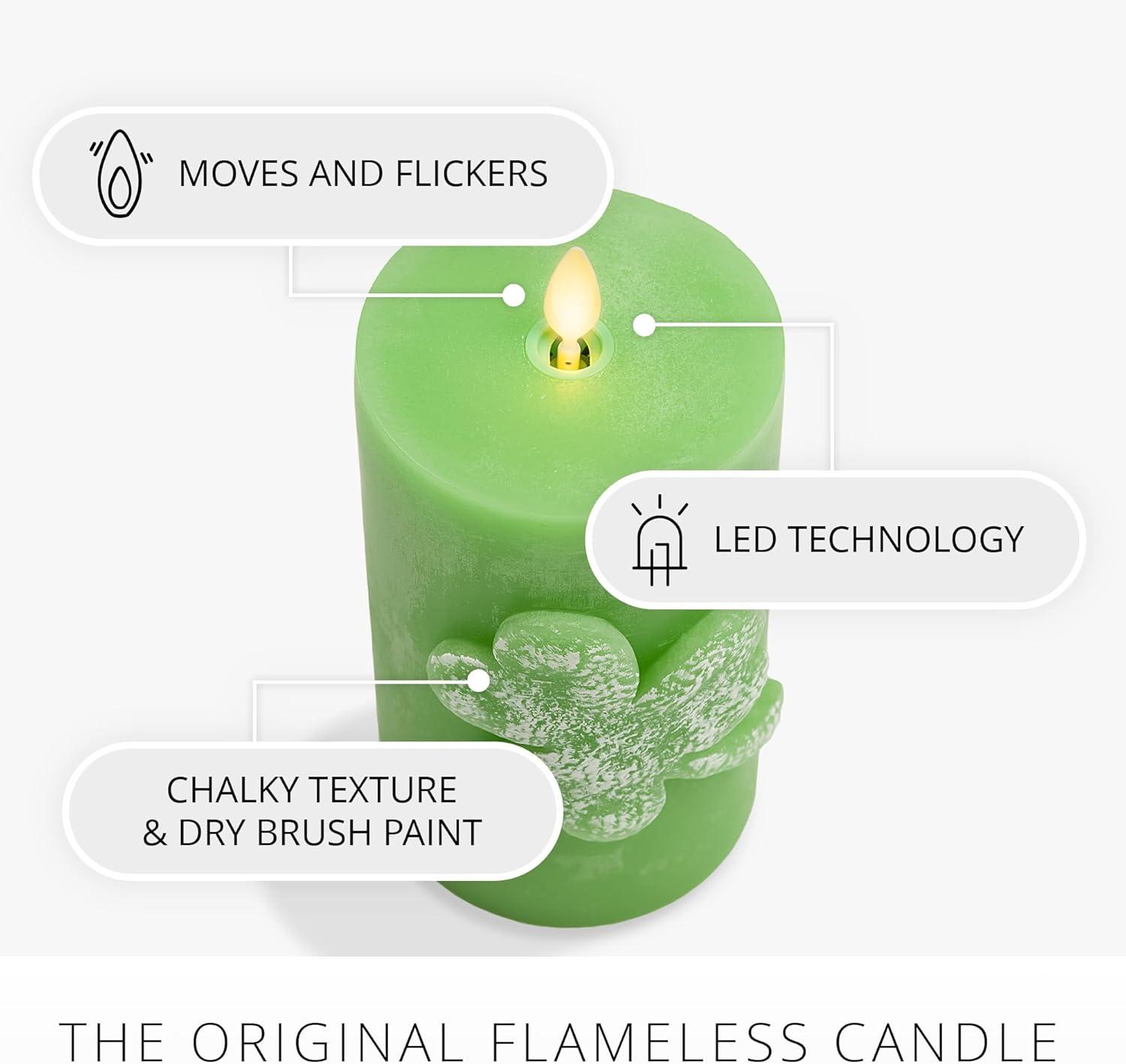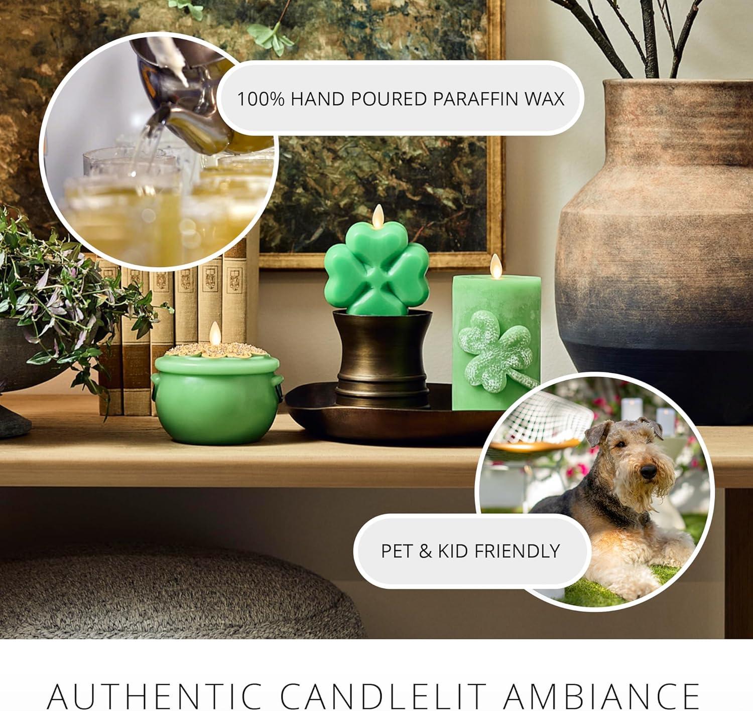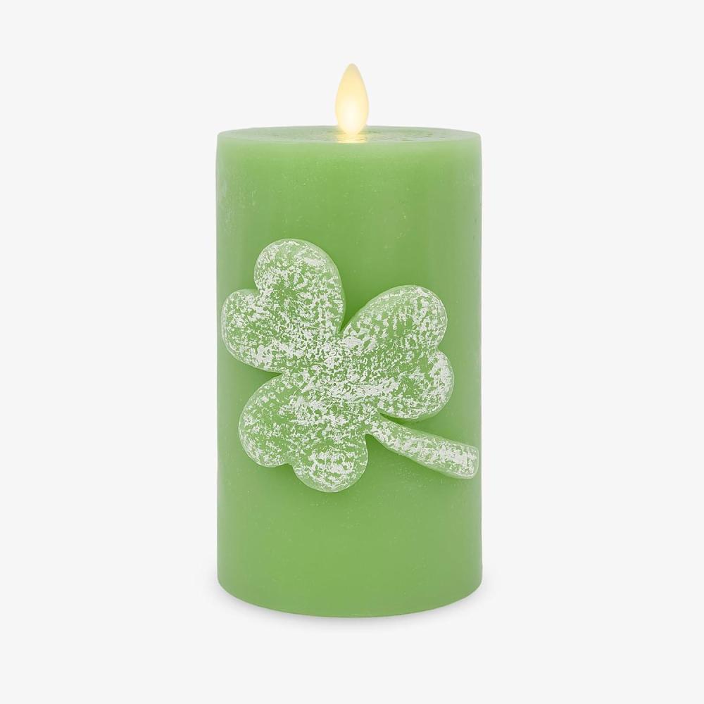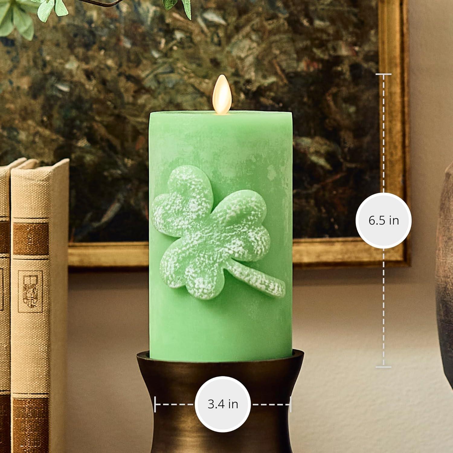 The Lucky Green Shamrock pillar candle features Luminara's exclusive Real Flame-Effect technology, creating a mesmerizing lifelike flicker. Add a touch of the luck of the Irish to your St. Patrick's Day holiday décor on the mantelpiece, bookshelf, or anywhere you like to have a cheerful candle glow. Perfect for people who love to showcase traditional Irish decorations all year long.