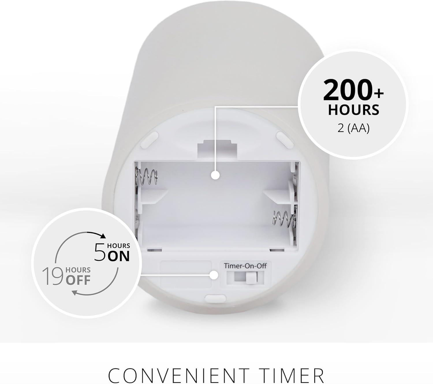 These pillar candles use 2 AA batteries to provide 200+ hours of illumination before needing to be replaced. The light given off is a warm white shade that is gentle on the eyes and adds to the realism, avoiding the harsh cold white light or garish yellow or orange of old-fashioned fake candles.